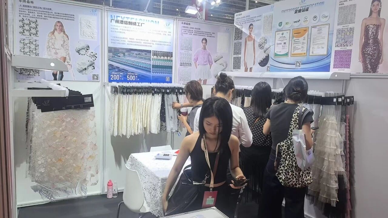澧信辅料展出的产品包括刺绣/蕾丝花边、刺绣/手工领花、立体花饰、弹力织带、五金配饰等全品类新品。公司名下绣花厂年产水溶花边1000万码以上,织带6000万米以上。